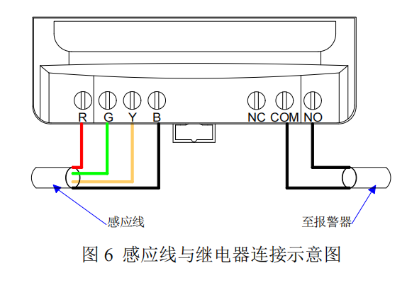 YEC-MM-A 控制器的繼電器觸點可用于本地或遠程報警,或聯(lián)動控制閥門等其它裝置,也可與控制自動化系統(tǒng)觸點輸入連接。繼電器僅針對泄漏報警工作,具有常開、常閉兩種狀態(tài),用戶可自由選擇接出方式。在整個泄漏檢測系統(tǒng)中,引出線用于連接控制器和泄漏感應(yīng)線。連接如下圖所示: