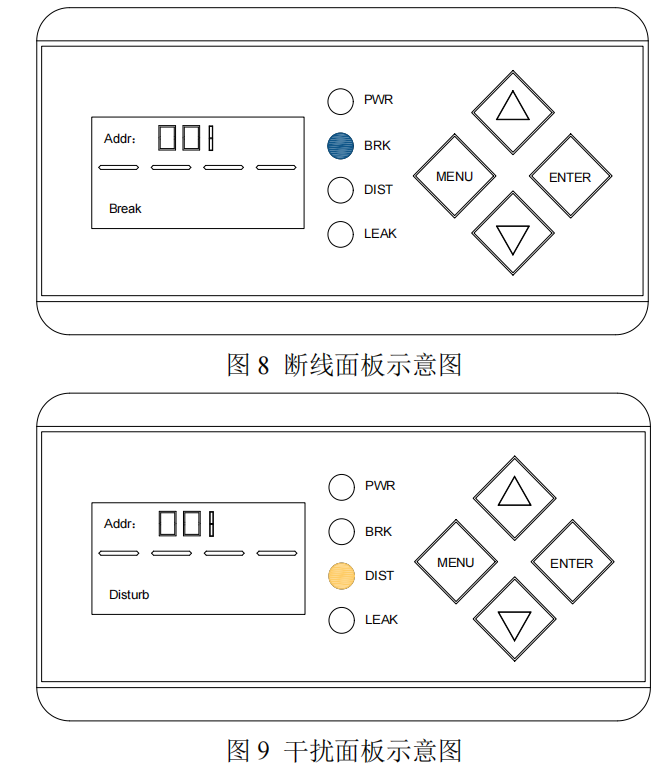 2. 斷線指示燈(BRK),正常熄滅,線纜斷裂呈閃爍狀態(tài);